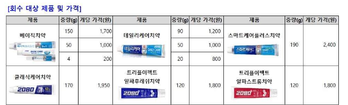이번에 회수 조치 대상이 된 건 총 6종의 2080치약이에요.